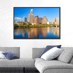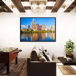 A view of Austin, Texas downtown skyline showing buildings, the river and trees with the city reflected in the water. The artwork is rendered in a realistic style using a blue, brown, green and white palette for a bright, clear urban feel. It suits modern wall decor in living rooms, home offices, or entryways.