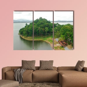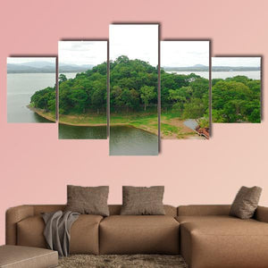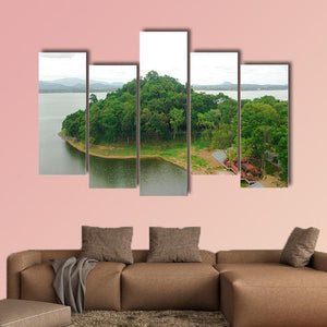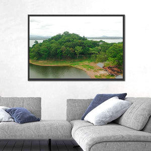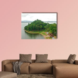 View Of Bang Phra Reservoir In Thailand depicts a lush green island in a body of water, with a building visible on the island’s right side. The realistic aerial perspective and muted green-blue-gray palette give the scene a peaceful, serene mood. It pairs well with modern living rooms or nature-focused spaces.