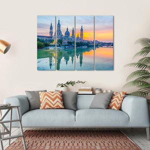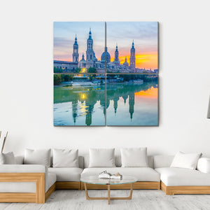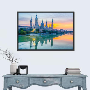 This canvas wall art beautifully captures the Basilica De Nuestra Senora De Pila, reflecting its majestic architecture amidst a serene river scene. The vibrant palette of blue, yellow, and orange adds warmth to any space.
