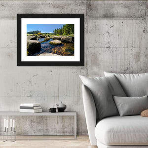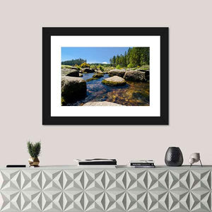 A low-angle landscape of the Dart River running through Bellever Forest in England, showing trees, sky, rocks and clear water with visible riverbed stones. The blue, green, brown and gray palette creates a calm, natural mood. Suited to nature-themed or rustic rooms, it brings a quiet, grounded presence to wall decor.