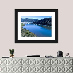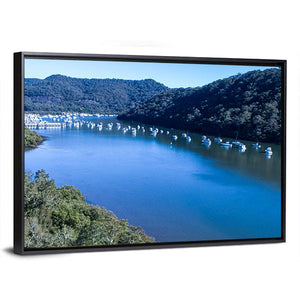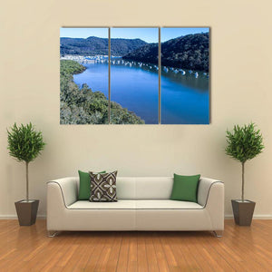 View Of Boats Moored On Hawkesbury River depicts a realistic landscape of a bay filled with moored boats, with distant mountains and tree-lined shores. Rendered in blues, greens and browns with an aerial perspective, the scene feels peaceful and serene. It suits modern or nature-inspired rooms as a calm focal point.