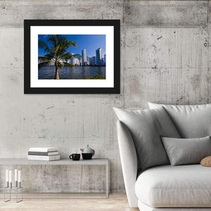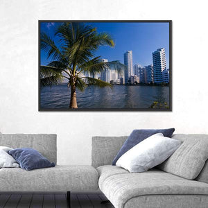 This photorealistic canvas art captures the vibrant scene of Boca Grande in Cartagena de Indias, featuring lush palm trees, serene water, and urban skyscrapers under a bright blue sky. Its tropical and urban vibe makes it an appealing addition to any modern décor.