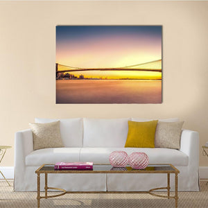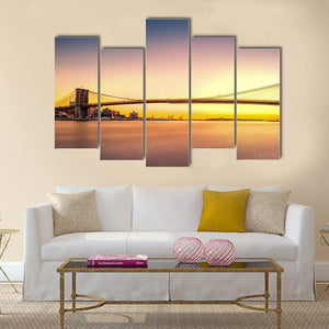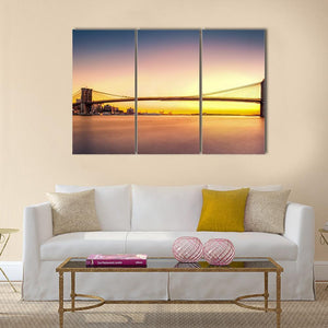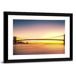 A serene view of the Brooklyn Bridge and city skyline at sunset, with long-exposure water that smooths the foreground. Calm blues, warm yellows and purples create a tranquil, modern landscape that works well in contemporary living rooms or home offices.