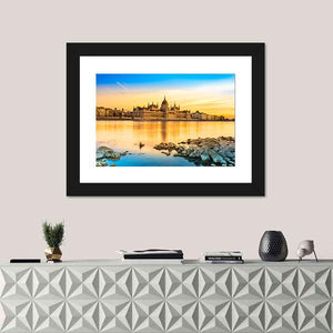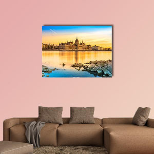 This canvas art beautifully captures the serene view of Budapest's parliament building at sunset. The warm palette of gold, blue, and orange reflects on the river, creating a majestic atmosphere perfect for any decor.