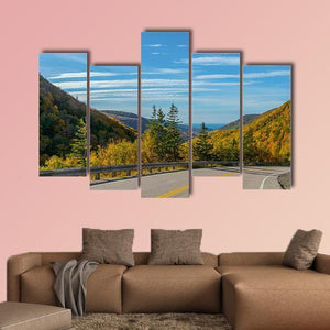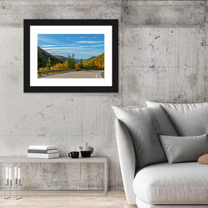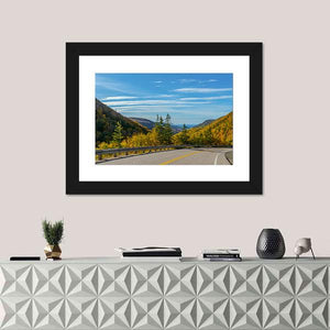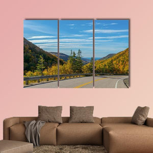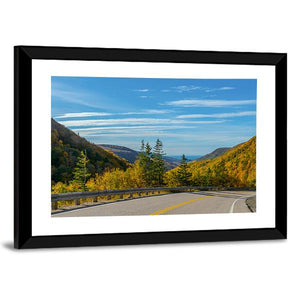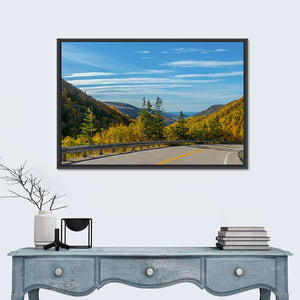 A realistic nature photograph of the Cabot Trail Highway in Canada, showing a winding road with double yellow lines, flanked by autumn trees and a metal guardrail. The layered perspective leads toward distant mountains beneath a partially cloudy sky, with greens, yellows, blues and grays creating a serene, scenic and adventurous mood. Suited to modern homes, living rooms, or travel-themed spaces.