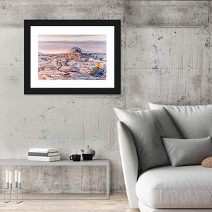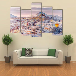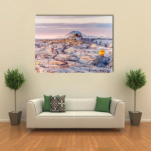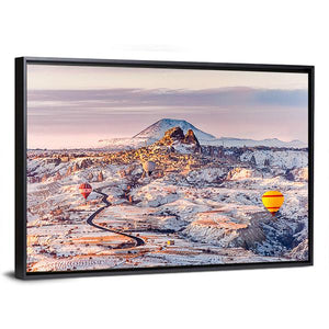 This canvas wall art captures the majestic landscape of Cappadocia, featuring a serene view of hot air balloons drifting over a snowy valley. The aerial perspective showcases the beautiful palette of white, brown, orange, pink, and blue, making it a captivating piece for any decor.
