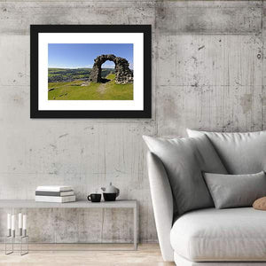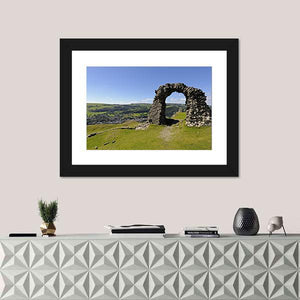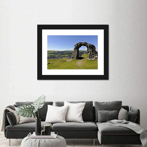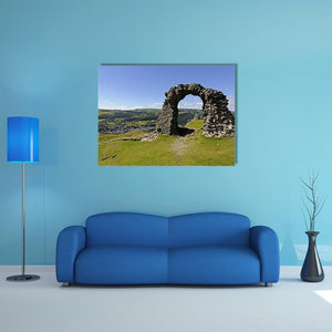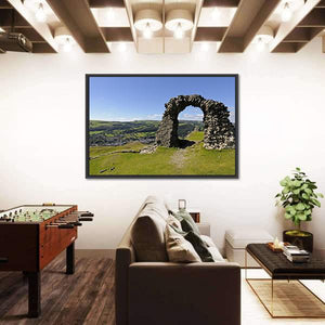 This landscape canvas features a serene view of the historic Castell Dinas Bran, showcasing a stone archway amidst rolling hills and a quaint village. With its calming palette of greens and blues, it brings a touch of nature to any space.