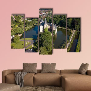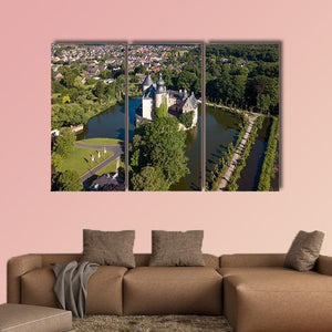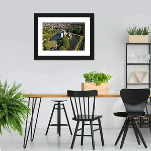 Castle Gemen captures an aerial, rule-of-thirds view of a castle beside its moat, framed by dense trees and nearby suburban houses. The realistic scene uses greens, blues, grays, and whites to create a peaceful, picturesque mood with gabled roofs and manicured lawns. It fits well with modern room decor, such as living rooms, home offices, or hallways.