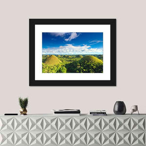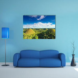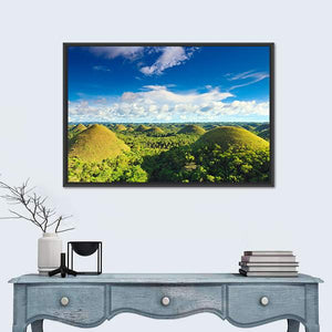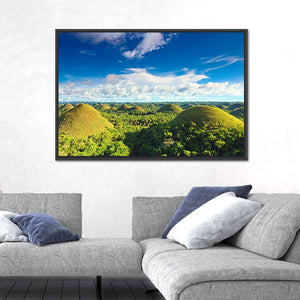 This canvas wall art showcases the breathtaking Chocolate Hills of Bohol, framed by vibrant green hills and a clear blue sky dotted with white clouds. Its serene and natural atmosphere makes it a perfect addition to any space.
