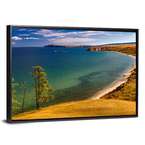 A realistic landscape of the coast of Baikal Lake, showing clear blue water, golden hills, trees and distant rocky formations. The scene reads serene and picturesque and suits modern or nature-inspired rooms such as living rooms, bedrooms, or offices.
