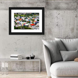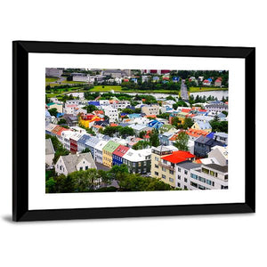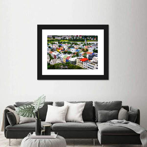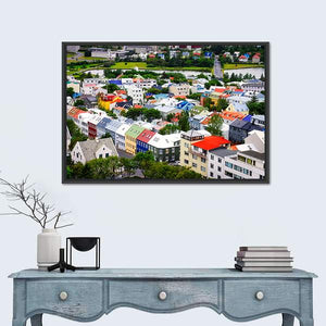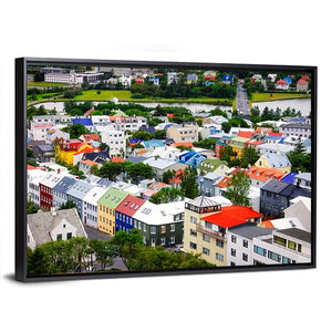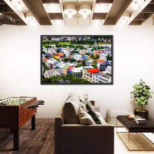 This canvas wall art captures a vibrant view of colorful houses in Reykjavík, showcasing a cheerful urban scene. The high-angle perspective highlights the bright rooftops set against a hint of water, perfect for adding character to any space.