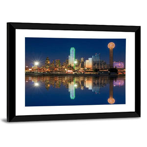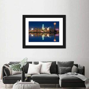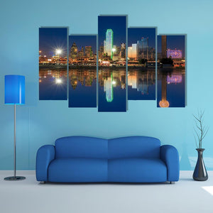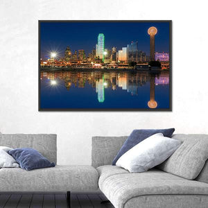 This modern canvas art features a vibrant city skyline of Dallas, showcasing tall buildings reflecting on water. The lively colors, including blue and neon green, capture the essence of urban life beautifully.