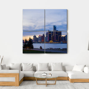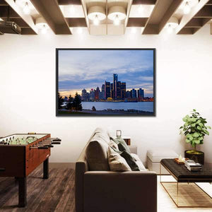 This canvas features a wide shot of the Detroit skyline at twilight, with tall buildings illuminated against a backdrop of a calm river. The blend of blue, gray, and orange hues captures a serene urban atmosphere.
