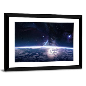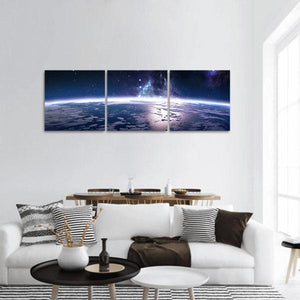 This panoramic artwork showcases a breathtaking view of Earth from space, highlighting the beauty of our planet alongside a galaxy filled with stars and clouds. The serene blue and white tones, contrasted with deep purples and blacks, inspire a sense of awe and cosmic wonder.