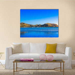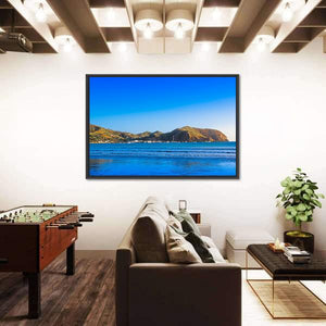 An ocean and beach scene showing calm blue water, multiple boats anchored in a bay, hilly shorelines with buildings, and a clear blue sky. The modern, vibrant palette of blues, greens, browns and white creates a serene, bright, tranquil mood and works well in modern or coastal room decor.