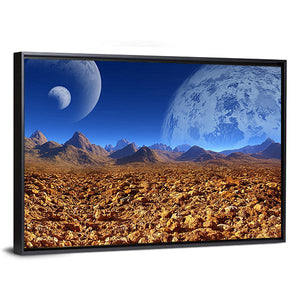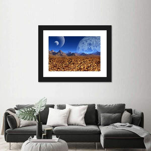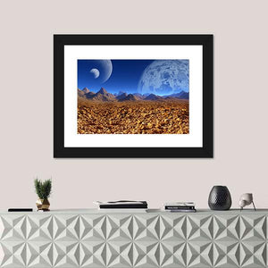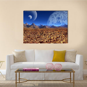 A digital science fiction scene depicting an alien landscape with jagged mountains and two planets visible in the sky. The wide, deep composition uses blue, orange, brown, and white to create a surreal, mysterious, and vast mood. It suits modern rooms as a distinctive piece of room decor.