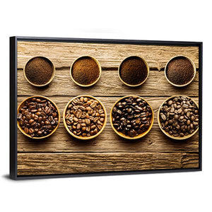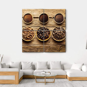 This canvas artwork features an inviting arrangement of coffee beans and ground coffee in rustic bowls. The warm brown and tan palette, paired with a symmetrical grid composition, brings a cozy vibe to your space.