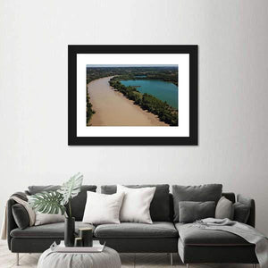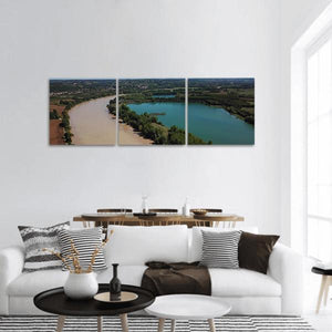 A panoramic view of the Garonne and a summer lake, showing river and treeline with contrasting blue and brown water tones. Rendered in a realistic, nature-photography style, it gives a serene, expansive feel. Suited to modern living rooms or offices that favor natural, calming art.