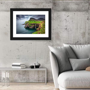 This canvas print captures the majestic Gasadalur Waterfall nestled among the dramatic cliffs of the Faroe Islands. The serene blend of greens and blues creates a calming atmosphere, making it a wonderful addition to any nature-inspired decor.