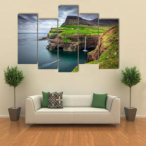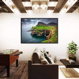 Photorealistic view of the Gasadalur waterfall on the Faroe Islands, set among coastal cliffs and the ocean. Dramatic lighting, stormy clouds, and a green‑blue‑gray palette create a dramatic yet serene mood; a boat leaves a wake while houses sit on the cliff tops. Works well in modern or coastal‑themed rooms.