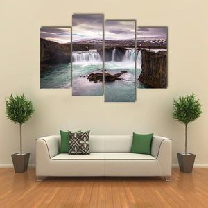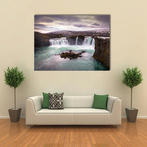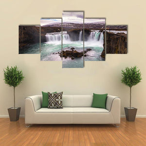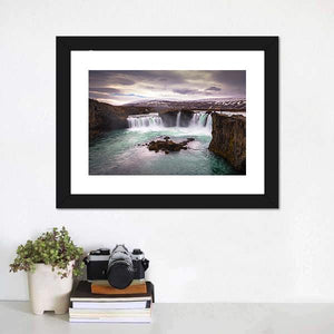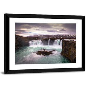 Godafoss Waterfall in Iceland captures a wide-angle landscape of rushing falls, river, rocky cliffs and snow-dusted mountains. The blue, green, grey and brown palette gives a dramatic yet serene, majestic mood, with small figures on a cliff edge adding scale. Suits modern or nature-inspired rooms as a bold focal wall art.