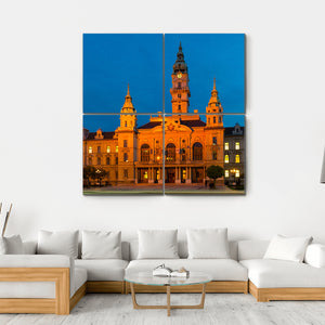 Experience the grandeur of Gyor City Hall captured at night. This realistic cityscape highlights the ornate facade and illuminated windows of the historic government building, creating a vibrant atmosphere with its rich palette of orange and blue.