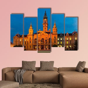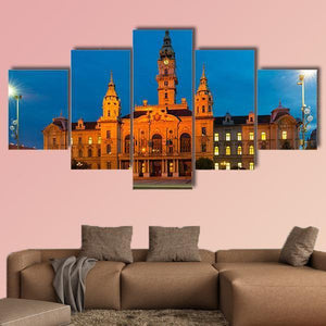 Gyor City Hall at Night features the town hall and its clock tower beneath a calm evening sky, the ornate facade lit by glowing windows. Rendered realistically in blues, oranges and warm yellows, the image has a grand, historic and peaceful mood that suits modern or historic-inspired interiors.