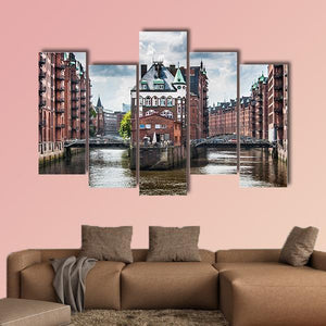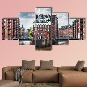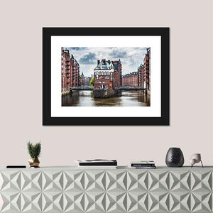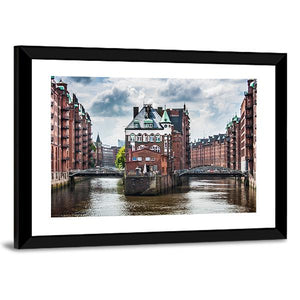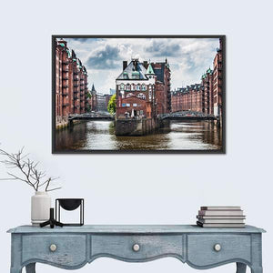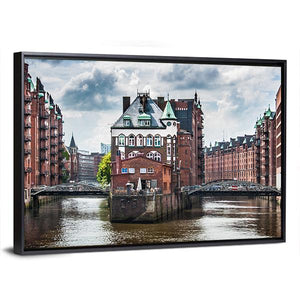 A photorealistic cityscape of Hamburg shows red brick buildings, green roofs and canal water beneath a cloudy sky. The rule-of-thirds composition gives a balanced, historic urban mood that works well in modern or urban-themed rooms.