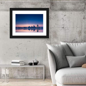 View of Jinji Lake in Suzhou City shows a modern city skyline mirrored across calm water. Soft blues, purples, pinks and greys at twilight give the scene a serene, reflective mood. It suits modern living rooms or offices that favor tranquil, contemporary wall art.
