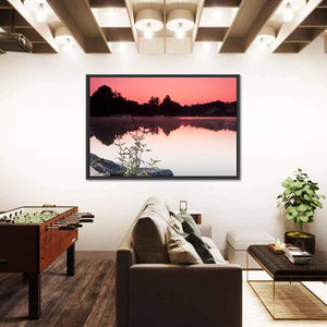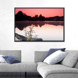 This canvas wall art features a serene landscape of a lake at sunrise, with delicate reflections and charming houses nestled among trees and rocks. Its calming palette of pinks, purples, and greens makes it an inviting choice for any space.
