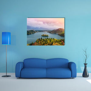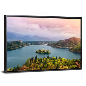 This beautiful canvas art captures the serene view of Lake Bled in Slovenia, featuring an island with a church and a castle surrounded by autumn trees. The picturesque blend of blue, green, and pink hues creates a calming atmosphere, perfect for any nature lover.