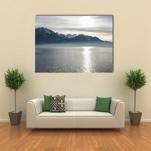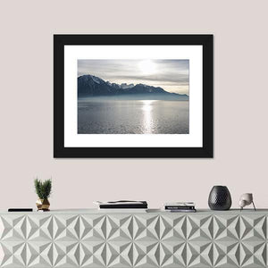 View Of Lake Geneva depicts snow-capped mountains and sunlight over a calm lake, with the peaks centered and mirrored in the water. Rendered in a realistic, naturalistic palette of blue, gray, white and silver, the scene feels serene and majestic. It suits modern home wall decor—ideal for living rooms or bedrooms.