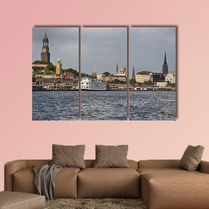 A realistic cityscape of Hamburg’s harbour, showing the skyline, waterfront and a ferry alongside a tall clock tower. The calm blue‑grey palette creates a peaceful, everyday atmosphere. Suited to modern room decor as a subtle cityscape focal point.