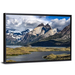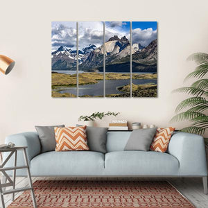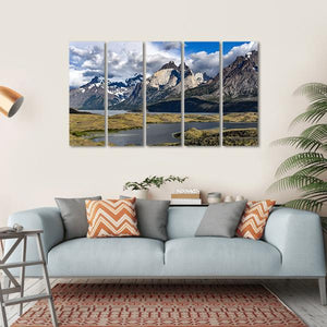 This canvas art captures a stunning landscape of mountains, a serene lake, and dynamic clouds. The photorealistic depiction reflects a majestic and wild atmosphere, making it a perfect addition to bring nature's beauty into your space.