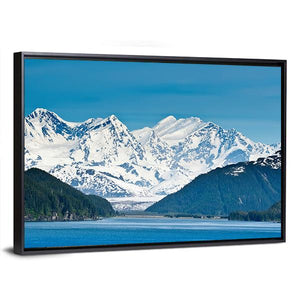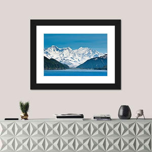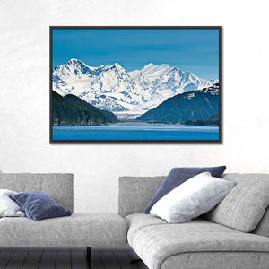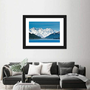 This realistic landscape print depicts snow-capped mountains rising above a coniferous forest and a calm body of water, with a glacier visible between the peaks. The cool blue, white, green, and brown palette creates a majestic, serene, and vast atmosphere that suits modern living spaces and bedrooms looking for a nature-focused focal piece.