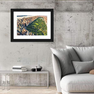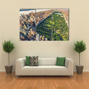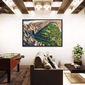 This vibrant canvas art captures a stunning aerial view of Manhattan, showcasing the iconic city skyline alongside Central Park. Its spacious composition evokes an urban feel, making it a striking addition to any modern space.
