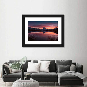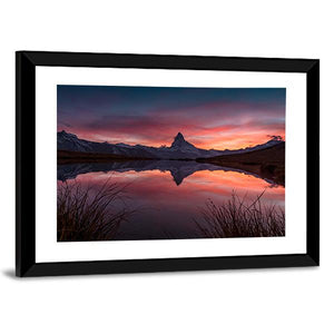 View of the Matterhorn mirrored in Stelli Lake captures a photorealistic mountain landscape at sunset, with a pyramidal peak, vibrant pink and orange sky, and a calm water reflection. Tall grass in the foreground and dusky tones create a serene, slightly dramatic mood that suits modern or nature-inspired rooms.
