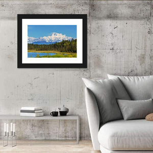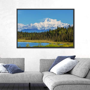 Capture the serenity of nature with this canvas featuring snow-capped McKinley Peak, framed by a lush evergreen forest and a tranquil lake. The bright blue sky and soft clouds create a peaceful atmosphere, making this artwork an inviting addition to your home décor.