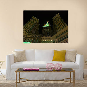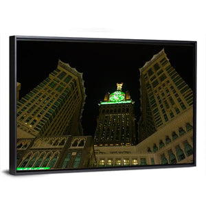 This canvas wall art captures the impressive Clock Tower of Mecca at night, showcasing a grand city skyline. Its low-angle perspective highlights the distinct architectural features and vibrant green illuminated signage, creating an urban atmosphere that complements modern décor.