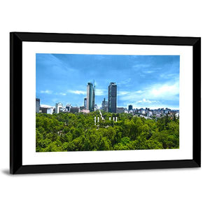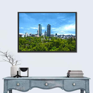 This canvas art captures a vibrant view of Mexico City, showcasing its iconic skyline alongside lush green trees and a bright blue sky. The modern landscape invites a fresh, urban energy into any space.