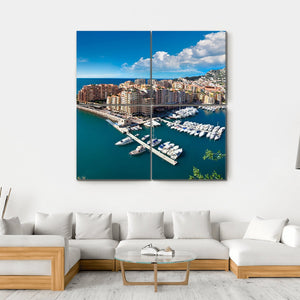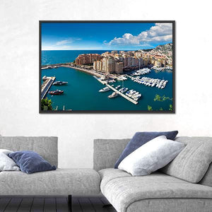 This canvas art captures the vibrant scene of Monte Carlo's harbor, showcasing a stunning city skyline filled with numerous yachts and elegant buildings nestled on the hillside. Its realistic detail and sunny palette of blues, tans, and whites evoke a sophisticated coastal atmosphere.