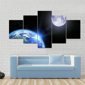 This captivating canvas art features a stunning view of the Earth and the Moon set against a cosmic background. With its rich blue and green hues, the piece evokes a sense of wonder and connection to the universe.