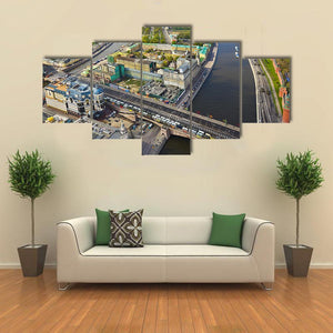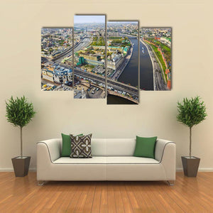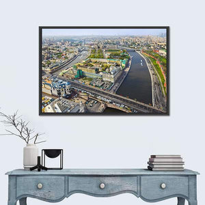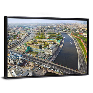 This canvas features a breathtaking aerial view of Moscow, showcasing its iconic skyline, the winding river, and vibrant urban life. The expansive composition captures a dynamic scene filled with vehicles on the bridge, boats on the river, and lush trees along the banks, creating a grand and scenic atmosphere.