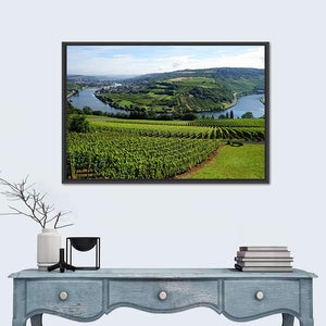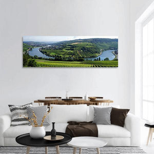 View Of Mosell Valley presents a high, panoramic scene of rolling vineyards, a curving river and a small village nestled in the hills. The realistic greens, blues and browns create a serene, pastoral mood that works well in living rooms, dining areas or quiet office corners.