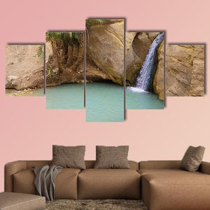 A centered view of the Chebika mountain oasis in Tunisia, featuring a calm waterfall, turquoise pool, rocky outcrops and palm trees. The blue, tan, and green palette creates a serene, natural mood that invites quiet reflection. Ideal for a modern living room or entryway as nature-focused wall decor.