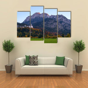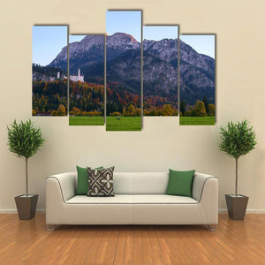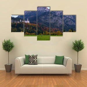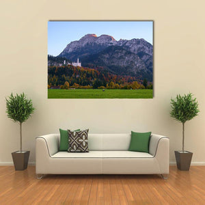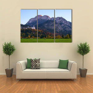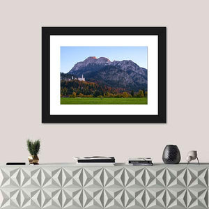 View of Neuschwanstein Castle shows the white castle on a hill, framed by autumn foliage and a sunlit mountain peak. The realistic, scenic print carries a serene, majestic mood and works well in modern or traditional living spaces.