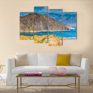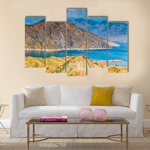 A photorealistic view of the Nurek Reservoir in Tajikistan, showing layered mountain ranges, vivid blue water and arid hillsides with sparse vegetation. The scene reads serene and majestic, a vast landscape that suits modern home interiors and room decor.