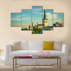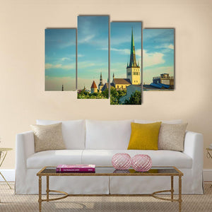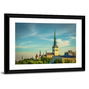 This canvas art captures a serene view of Tallinn's historic cityscape. Featuring a tall green spire, layered buildings, and a bright sky, it adds a touch of elegance to any space.