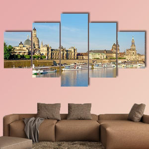 View of Old Dresden over the River Elbe shows riverfront buildings and passenger boats in a peaceful, historic daytime scene. The blue, tan, green, and white palette and rule-of-thirds composition create a calm, scenic look that works well in a living room, study, or hallway.