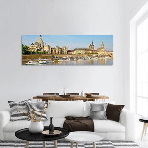 This photographic panoramic canvas captures Old Dresden along the River Elbe, featuring riverside architecture and boats under a clear sky. Soft blues, tans and greens create a serene, bright, historic mood that suits living rooms, studies, or entryways.